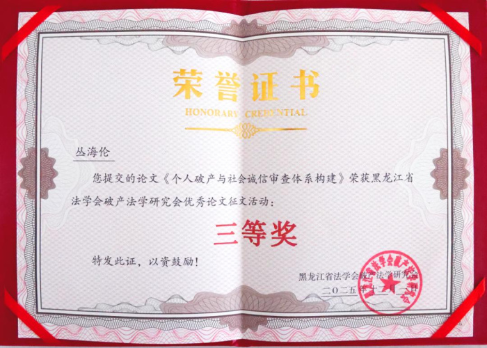 近日,黑龙江省法学会破产法学研究会优秀论文征文活动结果揭晓,双城区法院审判管理办公室(研究室)五级法官助理丛海伦撰写的论文荣获三等奖。